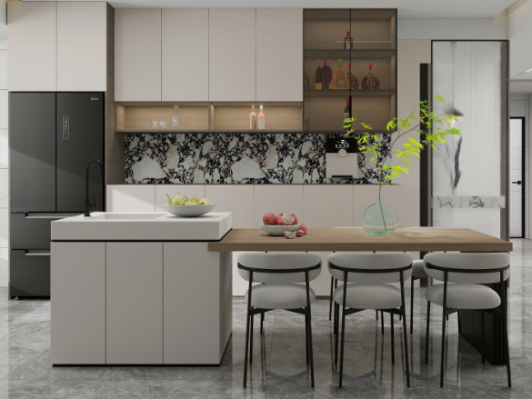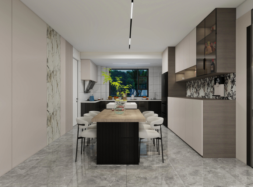 Sleek cabinetry, integrated appliances, and reflective marble flooring complete the modern, airy look that is ideal for stylish, open-concept living.